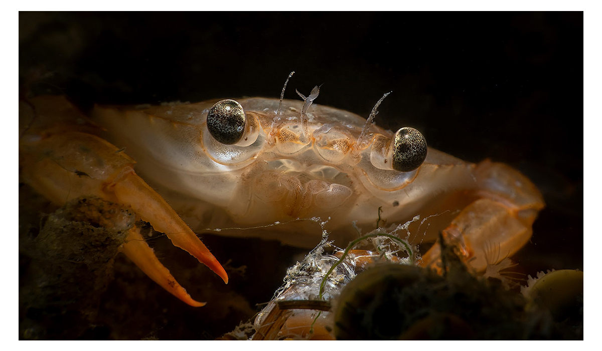 De ses grands yeux noirs il vous hypnotise ; d’abord surprise, je m’approche pour le voir de plus près. Sa carapace délicatement dorée, laisse apparaître une certaine fragilité et je tombe immédiatement sous le charme… de ce petit crabe incroyablement expressif et talentueusement photographié par Frédéric Lamothe.